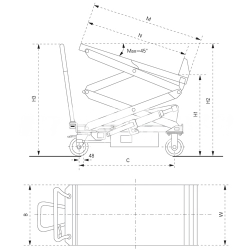 采用电动升降人力推行操作,起升状态下台面自动倾斜至45°